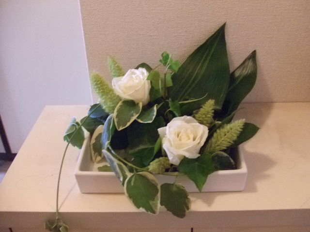 【使用花材】バラ・アイビー・粟(観賞用)・レモンリーフ・ハラン他